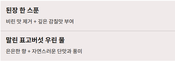 - ✔ '된장 한 스푼'과 '말린 표고버섯 우린 물'로 맛의 깊이를 더한다.