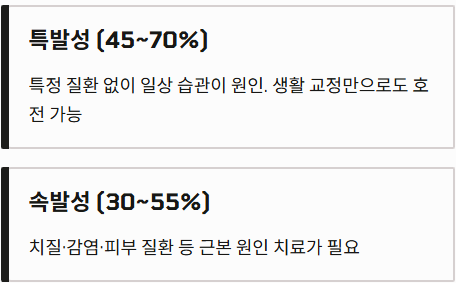 | 특발성 (습관/식이) | 약 60% | 생활 습관 교정으로 호전 가능 |