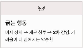 - 가려울 때 긁기: 손톱으로 긁으면 미세한 상처가 생기고, 이 상처를 통해 세균이 침투하여 2차 감염이 발생합니다. "긁으면 가려움은 잠시 사라지지만, 피부는 더 두꺼워지고 가려움은 더 심해지는 악순환에 빠지게 됩니다."