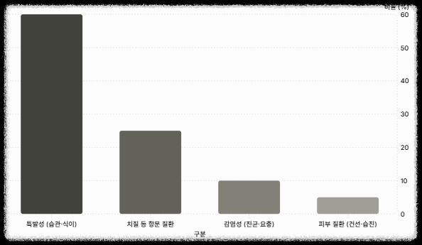 | 감염성 (진균/요충) | 약 10% | 약물 처방 필수 |