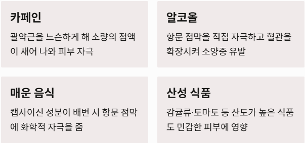 - 식이 요인: 카페인(커피), 카페인이 든 차, 알코올, 매운 음식 등은 항문 주변 점막을 자극하여 소양증을 유발하는 대표적인 식품들입니다.