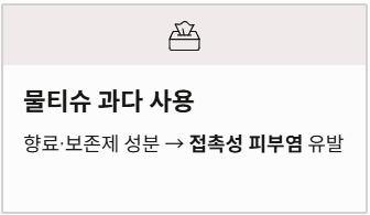 - 물티슈 과다 사용: 물티슈 속의 향료나 보존제 성분이 화학적 자극을 일으켜 '접촉성 피부염'을 유발할 수 있습니다.