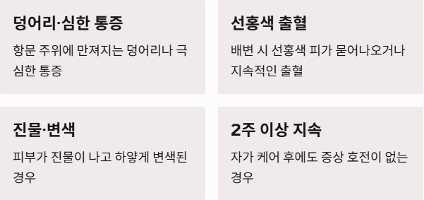 단순 가려움을 넘어 다음과 같은 증상이 동반된다면 즉시 대장항문외과를 방문해야 합니다.